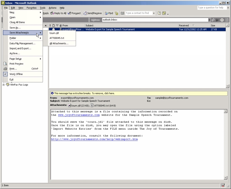 METHOD 2:If you chose to send the entries as an email message, you will want to open the email message that is sent from the website. The following example will demonstrate this process using Microsoft Outlook. Any email client will work as long as you are able to save the files attached to the email message.