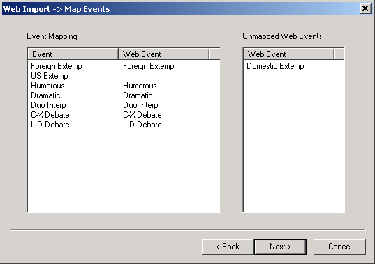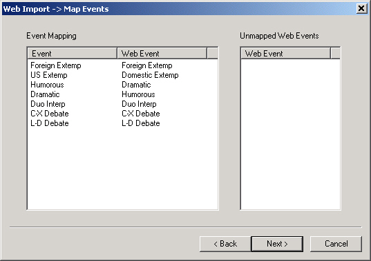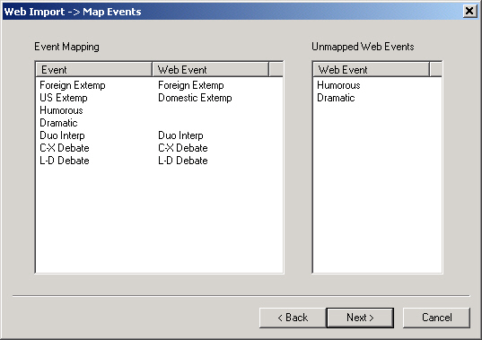 There are two different things that will need to be 'mapped'. First, any existing events will need to be mapped to those on the website. If you have entered the events into The Joy of Tournaments, you will need to make sure that the event mapping is correct. For example, if you host US Extemp, the website may refer to that event as Domestic Extemp. These two events are actually the same event, but they have different names. The 'mapping' process allows you to specify which event that you have on your PC maps to which event on the website. Many times, this process will be done for you. After you map your events once, the software will remember your mappings for each subsequent imports.