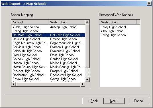 Once you have all of the events mapped correctly, you are ready to press the button labeled Next. You should see the 'Map Schools' dialog appear similar to the following: