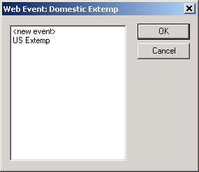 To provide a 'mapping' for the Domestic Extemp event in this example, you would double-click the 'Domestic Extemp' event in the right-hand list. Next you would see a dialog allowing you to select an appropriate event.