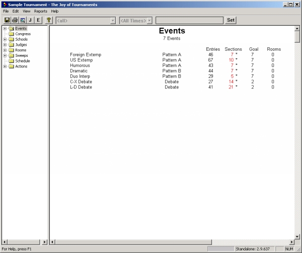 When this process completes, you may press the button labeled Finish that will appear. All of the schools, entries, and judges that were recorded on the website will then be available on your PC. For example, if you will compare the following screenshot to the first one on this page, you will see that several more entries have been recorded after the import.