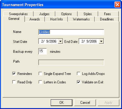 In the field labeled "Name", replace "Untitled" with the name of your tournament (e.g. "2006 Invitational Tournament"). This "title" will appear in the title bar of the Joy of Tournaments as you work on the tournament and it will appear at the bottom of each page that you print while using the software.