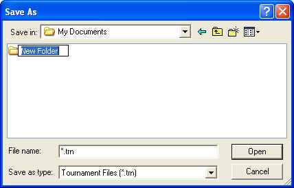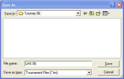 IMPORTANT: You must REPLACE the "*.trn" that will initially appear in the "File Name" field with a file name representing your tournament (e.g. "LHS 06"). The asterisk in the filename must be removed or your data cannot be saved.