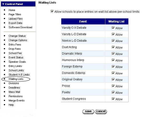 By default, the only waiting list option that will be turned on is the overall entry cap waiting list. If you want to also provide the second option (a waiting list for entries beyond the school limit), check the option at the very top of the page labeled "Allow schools to place entries on wait list above per-school limits".