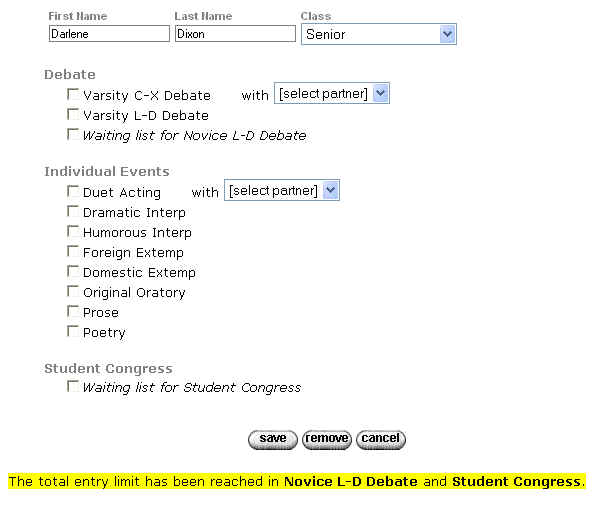 The first function of the waiting list kicks in when the overall entry limit for an event is reached. You may establish that the total entires that you will accept in an event is some magical maximum number. For example, you may only have 8 rooms to allocate to a particular event. If you are planning to place 7 students in each section, your entry cap would be 56. Once 56 competitors have been accepted in the event, you just don't have any more room. You can indicate to the website that entries should be deferred to the waiting list after 56 entries have been accepted. When a coach goes to try and register the 57th student, they will see a screen similar to the one above that only allows them to place additional students on the waiting list.