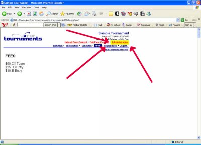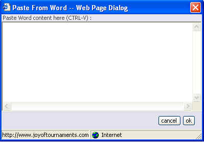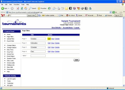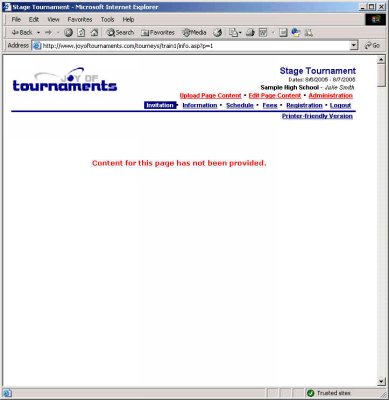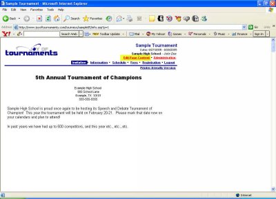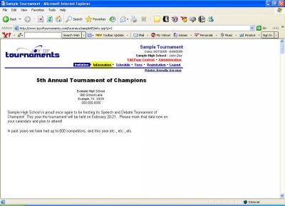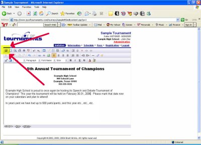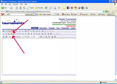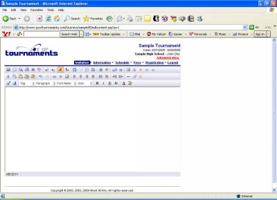Simply click inside the big white text area, and you're ready to type the first page you wish to display for schools interested in your tournament. If you've already sent out packets inviting teams to your tournament, feel free to re-type word for word what you sent out to the schools. However, we'll also look at how you can cut and paste from existing documents saved on your computer.