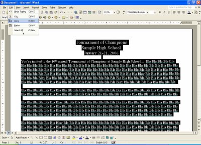 To Copy and Paste from a Word document, highlight the text in Word that you wish to post on the first page of your website. (For example, if the first page is the Invitation, you'll open the invitation you sent out to the coaches and high light the text.) Click Edit then Copy there in your Word document.