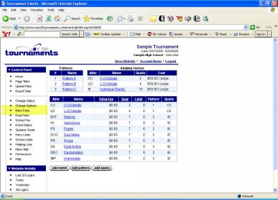 One of the best features The Joy of Tournaments website registration is that it keeps track of the fees each school incurs, so this is a key step to setting up your site. You've already set judges' fees when you set judge quotas. The other three fees typically charged at speech and debate tournaments are entry fees, school fees, and drop fees.