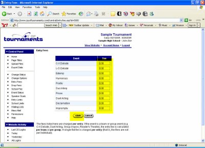 In the box next to each event, simply type in the fee for that event. For one-person events you're entering the fee per person, and in pairs or group events you're entering the fee per team. When you've typed in all the appropriate fees, click Save. You will then be returned to the previous page, which should now include the entry fees you've just saved.