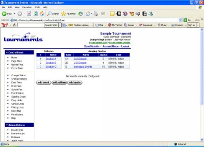 After you've entered all of your tournaments' events and clicked Save for the last time, you should be back at the page that lists each of your tournament's Patterns, Judge Quotas, and Events.
