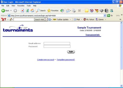 | When you sign up to host a tournament on the website, you'll be given an address (called a URL) that will be used to point users to your tournament registration. A typical URL will be something like http://www.joyoftournaments.com/tourneys/sample05/ or http://www.joyoftournaments.com/tx/mckinney/. When you're publicizing your tournament, you may point users directly to your registration website by using your URL. If you prefer, you can just point them to http://www.joyoftournaments.com and then have them find the link to your tournament off of the home page of the website. |